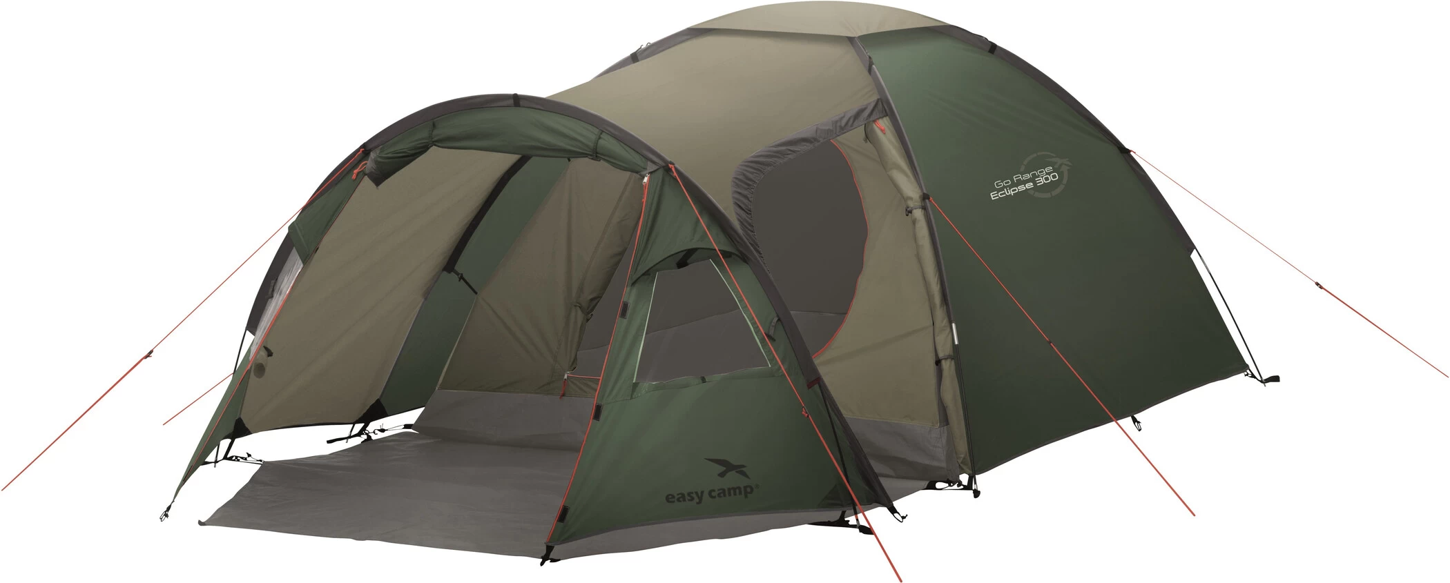 Bij de Eclipse 300 wordt de buitentent eerst opgezet. Deze koepeltent heeft een derde boogstok die een grote verlengde vestibule creëert aan de voorkant van de hoofdtent. Deze handige leefruimte heeft een tentvloer en veel bergruimte voor essentiële buitenspullen. Daarom is de tent ook geschikt voor tochten met de motorfiets. De tent heeft een vooringang en een zijdeur. Twee ramen en de bijbehorende ventilatieopeningen zorgen voor de beste lichtinval en optimale luchtcirculatie in de vestibule. De grote Eclipse 300 is de perfecte oplossing voor kampeerders die met een kleine auto rondreizen en ruimte nodig hebben voor een beetje luxe.