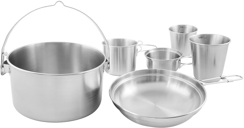 Klaar voor zeer zuinig. Met volumeschaalverdeling in pot en kopjes. Een pot met deksel, twee bekers zonder handvatten, een beker met inklapbaar handvat en deksel – verpakt in een praktische, afwasbare netzak.